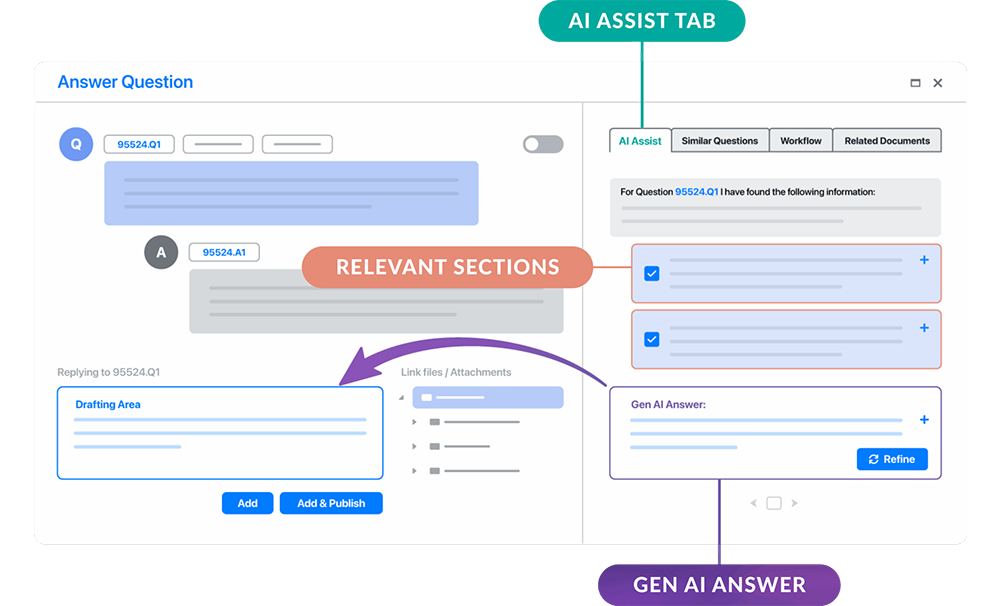 Our market-leading Q&A tool enables fast and efficient communication between the seller and buyer. Smart Q&A pinpoints relevant documents, highlights supporting paragraphs, and drafts high-quality answers automatically.
